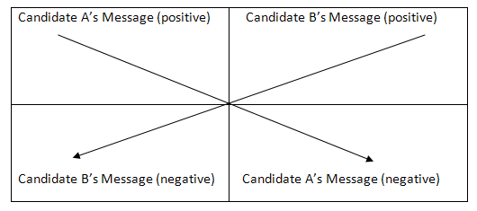 As an example, a candidate will usually be successful if the election issues are focused on his/her strengths and the opponent’s weaknesses. That means candidate “A” should think in terms of a diagonal line in the issue box running from the upper left box to the lower right box. That should keep the campaign “on message”. The opponent “B” should concentrate on the same strategy, emphasizing “B’s” positives and “A’s” negatives.