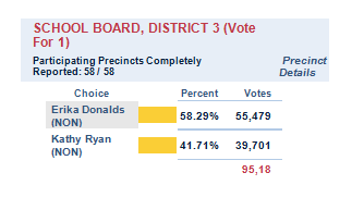 A candidate's performance can be measured against party turnout to determine the strength of the campaign. Let's analyze this school board election. Kathy Ryan is a well known Democrat and Erika Donalds was widely supported by the county Republican party. Even though the election was non-partisan it's possible to make some comparisons.
