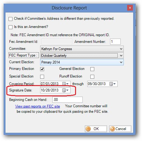 Signature date added to FEC reporting.  This will allow you to run your report days before it's due, but still set the signature date to the due date (or any date you wish).
