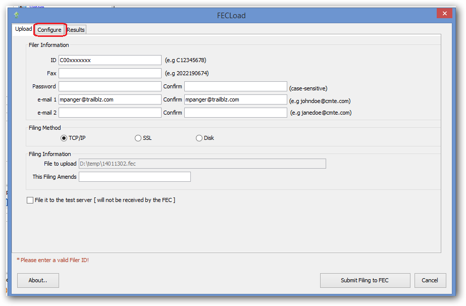 If you file FEC reports for several Trail Blazer customers, the FEC upload tool will load the proper committee number on the upload screen.  You need only enter your password.