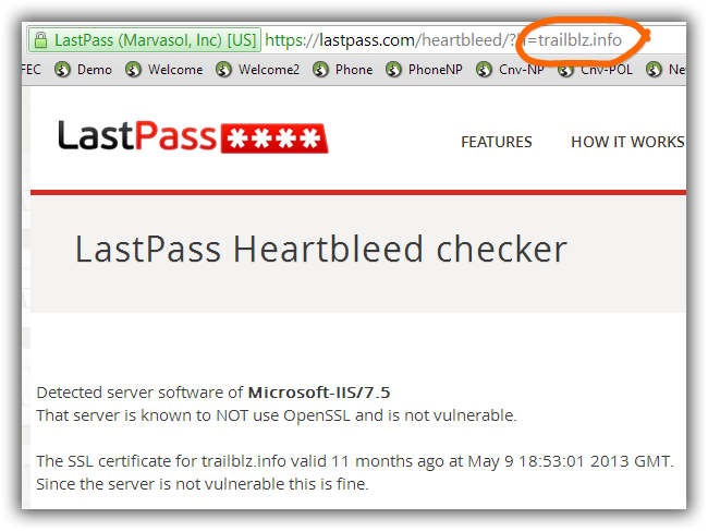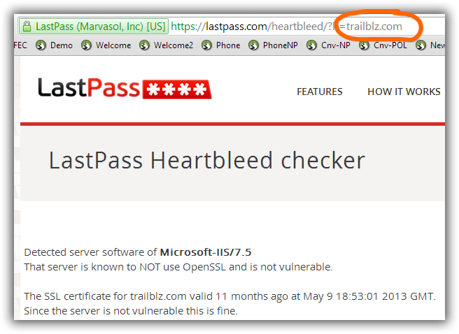 Do you get your news via TV, radio, or straight off the internet?  Hard to miss the conversation around the OpenSSL vulnerability.  The website https://lastpass.com/heartbleed/  offers a way for you to determine if the sites you visit are vulnerable.  They gave us a clean bill of health.  We have two domains in use; trailblz.com and trailblz.info.  Here are the results:
