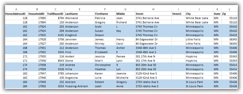 In the sheet above, you can see that the house with AddressID of 162 has two different HouseholdID's.  This is an indication that house should be reviewed to see if it should be re-householded.  This will likely lead to a discussion regarding whether or not people with different last names should be householded together (see HomeAddressID 184 at the bottom of the sheet and notice the last names).