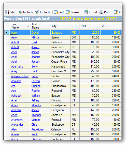 Is there a report that we can run that will tell us donors who have increased their donations calendar year 2013? We would like to check out increased donations from current donors. Thanks