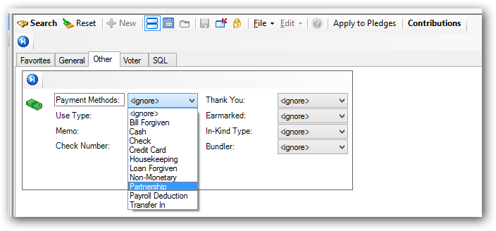 Partnership was added to the Payment Methods drop down in the Contributions list:
