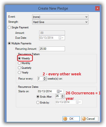 Pledges - weekly pledges are now supported.  This means if you have a bi-weekly payroll deduction, you can now enter them into the pledges.