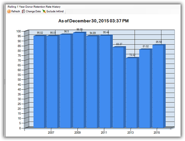 The chart can be configured for ANY rolling 10 year history (assuming you have 10 years of donor history).  You also have the option to exclude inkind-only donors from the calculation.