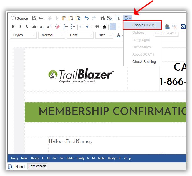 Today's Tip: Enabling SCAYT for Spell Checking Emails 18 February 2020 Joel-Kristenson When working on an email it's useful to make sure your spelling is correct before hitting send (especially for large email campaigns that you're sending from your database). To enable a spell checker you can follow these steps: Step 1 Step 2