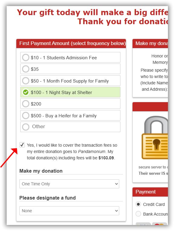 This article walks through the steps to add a checkbox for donors to optionally cover your merchant gateway payment processing fee for donations and event ticket sales: https://www.trailblz.com/kb/?action=view&kb=1378&cat=0&qq=fee