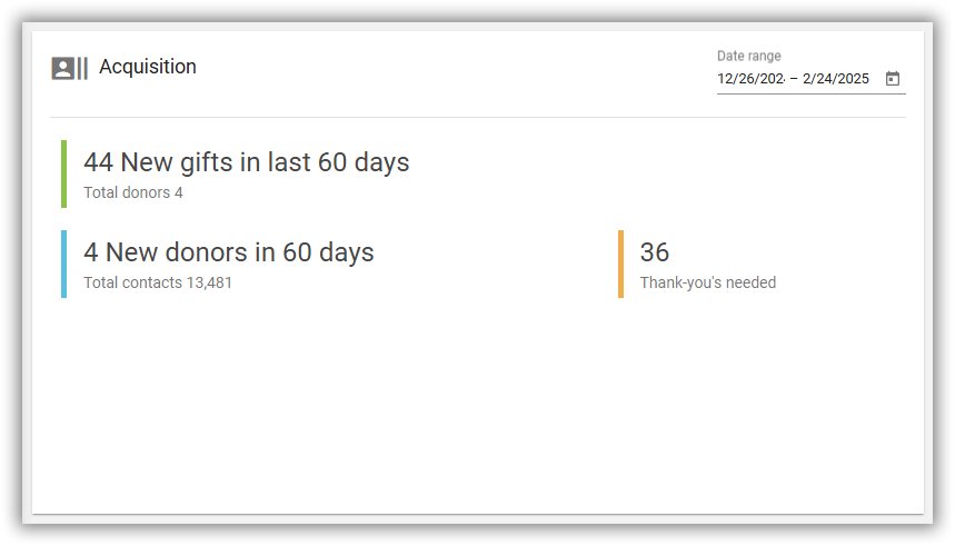Acquisition Widget 24 February 2025 Joel-Kristenson Check out some of the new dashboard widgets by logging into your Trail Blazer IQ Workspace: https://trailblazeriq.com/admin/Here's an example of the Donor Acquisition Report: